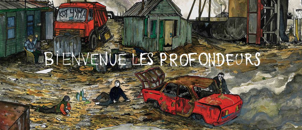 Bienvenue les profondeurs est un projet singulier composé de soixante-six aquarelles et de poésie. C’est le portrait d’une ville industrielle issue du secteur primaire et des résultats d’une violente exploitation. Parce que la ville est le personnage principal, on la découvre avec le maître des clés, sous la forme d’une promenade. Ce recueil est un hymne à l’apocalypse, un dévoilement des restes du monde industriel, des humains marchant entre les engrenages d’une gigantesque machine. C’est l’illustration de l’autodestruction à l’état labyrinthique dans lequel notre univers s’enfonce, l’anticipation de ce que pourrait être l’avenir de nos sociétés basées sur la consommation à outrance. Qui est coupable d’un tel dénouement, l’industrie, la politique, les ouvriers, le capitalisme ? Le recueil s’articule en tableaux individuels formant un univers à la fois mystique et infernal : l’abandon, la rouille, les déchets, la souillure du temps sur les installations humaines.